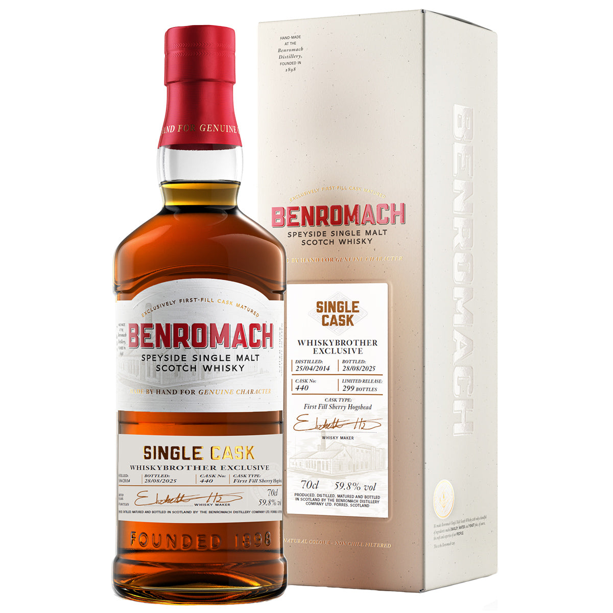 Our first exclusive release from the Benromach distillery in Speyside! This lightly peated official bottling was distilled on 25 April 2014, matured for 11 years in a single first-fill Oloroso sherry hogshead, and bottled on 28 August 2025. Only 299 bottles were produced. Non-chillfiltered, naturally coloured and bottled at a cask strength of 59.8%.